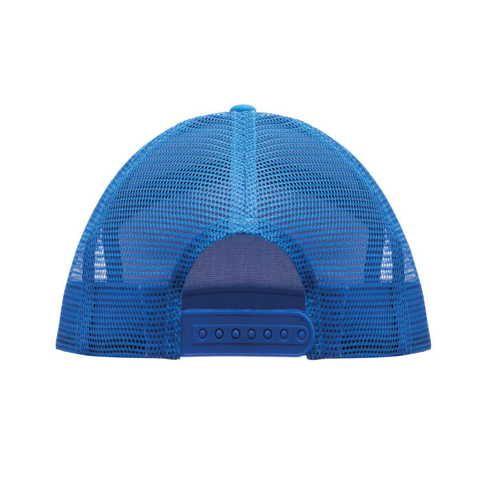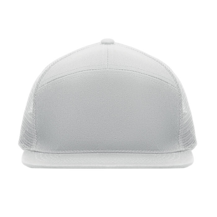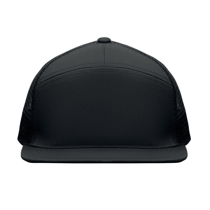 Cappellino con visiera piatta a 7 pannelli in twill di cotone con retro in rete di poliestere e chiusura in plastica.