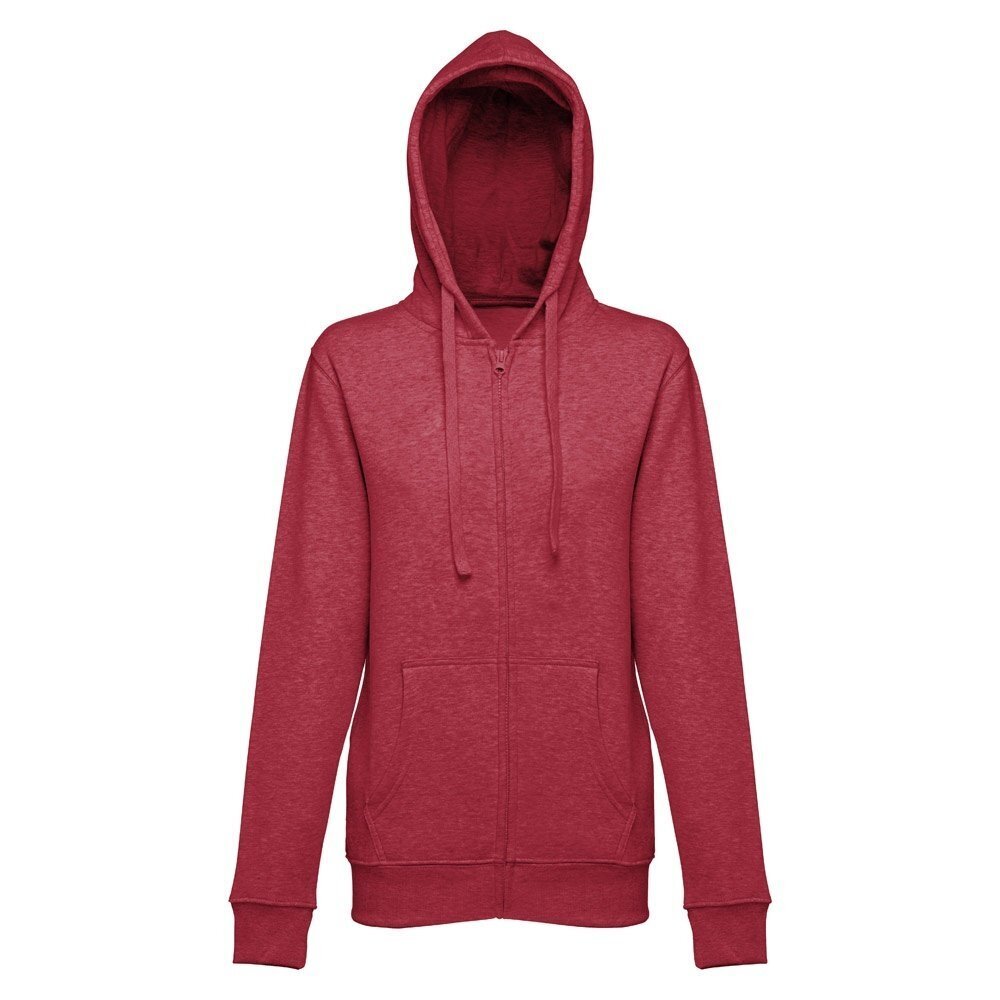 Felpa da donna, con zip e cappuccio in 50% cotone e 50% poliestere (320 g/m²) con interno spazzolato. Cappuccio con coulisse e con cordoncino in tinta. Presenta 2 tasche a marsupio con cerniera. Polsini e vita a costine. Taglie: S, M, L, XL, XXL