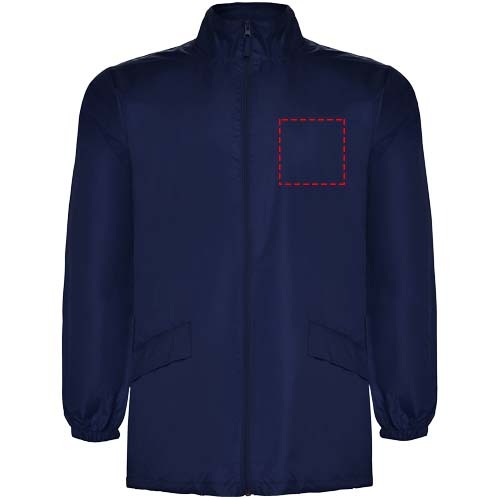 Impermeabile. Collo alto e cappuccio ripiegabile con cordoncino regolabile. Cerniera anteriore con tiretto abbinato. Due tasche laterali con pattina. Polsini elasticizzati. Fascia elastica all’interno della tasca per ripiegarlo e riporlo. Modello impermeabile. Il modello è alto 185 cm ed indossa una taglia L.
