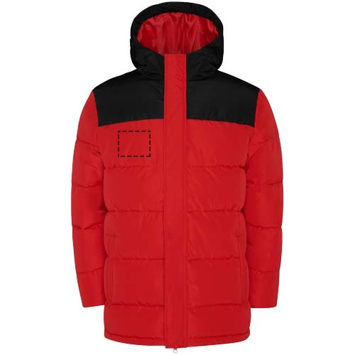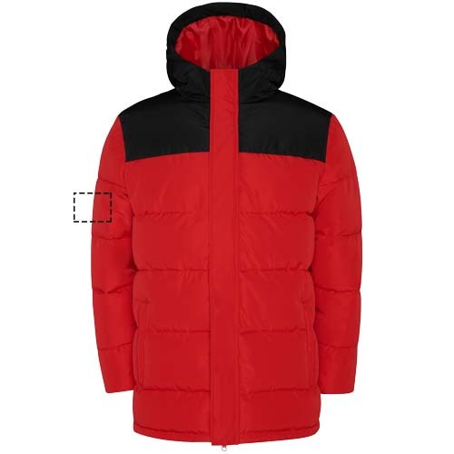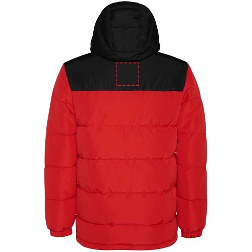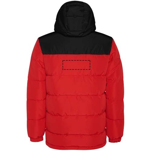 Giacca imbottita con cappuccio fisso. Cerniera anteriore coperta da una pattina. Proteggi mento. Due tasche laterali con zip. Polsini elasticizzati.