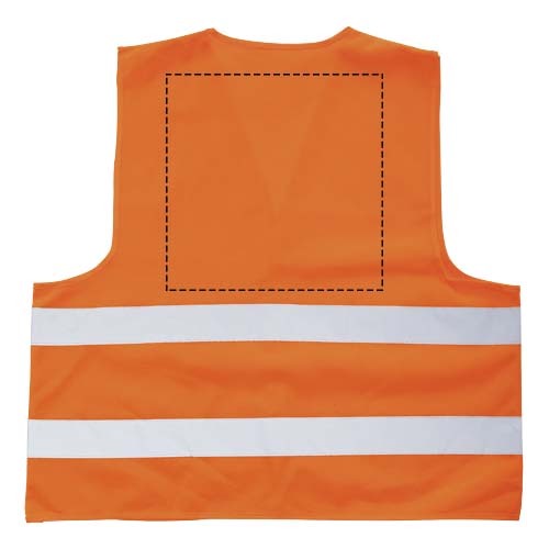 Gilet ad alta visibilità di classe 2, adatto a persone di altezza compresa tra i 165 e i 180 cm. Ampia area decorativa sul fronte e sul retro del gilet. Indumenti ad alta visibilità per uso professionale. Base fluorescente e nastro riflettente. Norma EN ISO 20471:2013+A1:2016. Questi indumenti recano la marcatura CE per dimostrare la conformità al Regolamento UE 2016/425/UE Dispositivi di protezione individuale di II categoria.