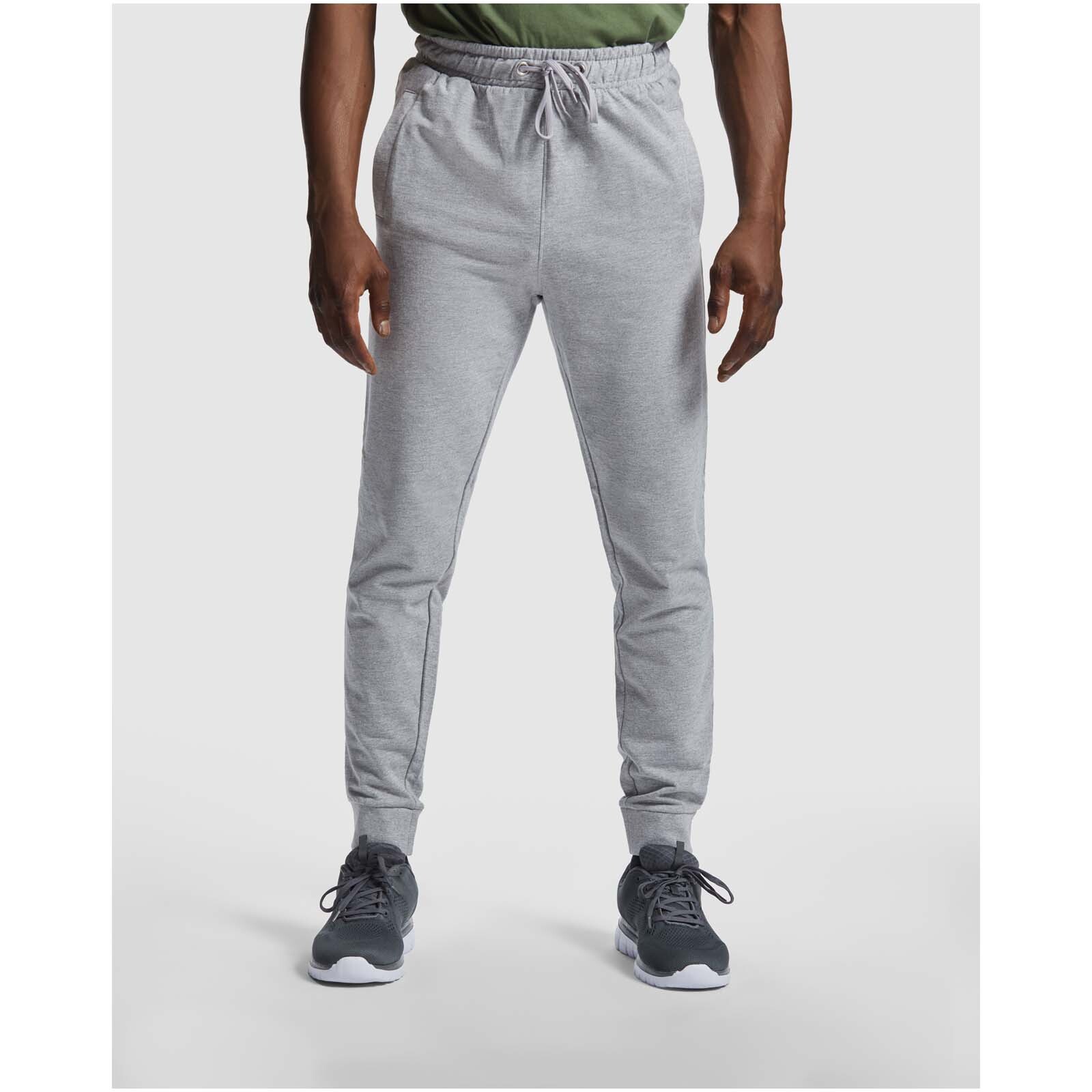 Pantaloni sportivi con ampia fascia regolabile in vita, cordoncino, bordi a coste aderenti alle gambe, cuciture rinforzate, tasche laterali a coste e tasca posteriore ad angolo con impuntura a vista. Etichetta rimovibile.