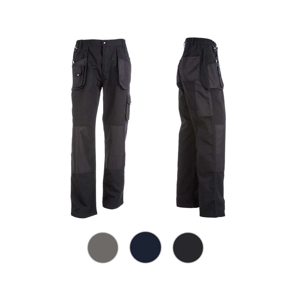 Pantaloni da uomo 80% cotone e 20% poliestere (260 g/m²) con rifiniture riflettenti nella zona frontale e rinforzo in oxford sulle ginocchia. Contiene 8 tasche:, di cui 3 con chiusura a strappo e 1 per il cellulare. Vita con elastico e fibbia in plastica per moschettone