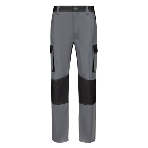 Pantaloni in twill multi-tasca bicolore (240 g/m²), in cotone (35%) e poliestere (65%). Taglio Slim Fit, vita elasticizzata e rinforzo in tessuto sulle ginocchia e sul retro. Sei tasche (2 tasche francesi, 2 tasche laterali a soffietto e 2 tasche posteriori a soffietto). Taglia: 34, 36, 38, 40, 42, 44, 46, 48, 50, 52, 54, 56, 58, 60