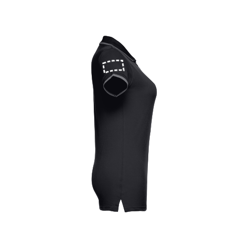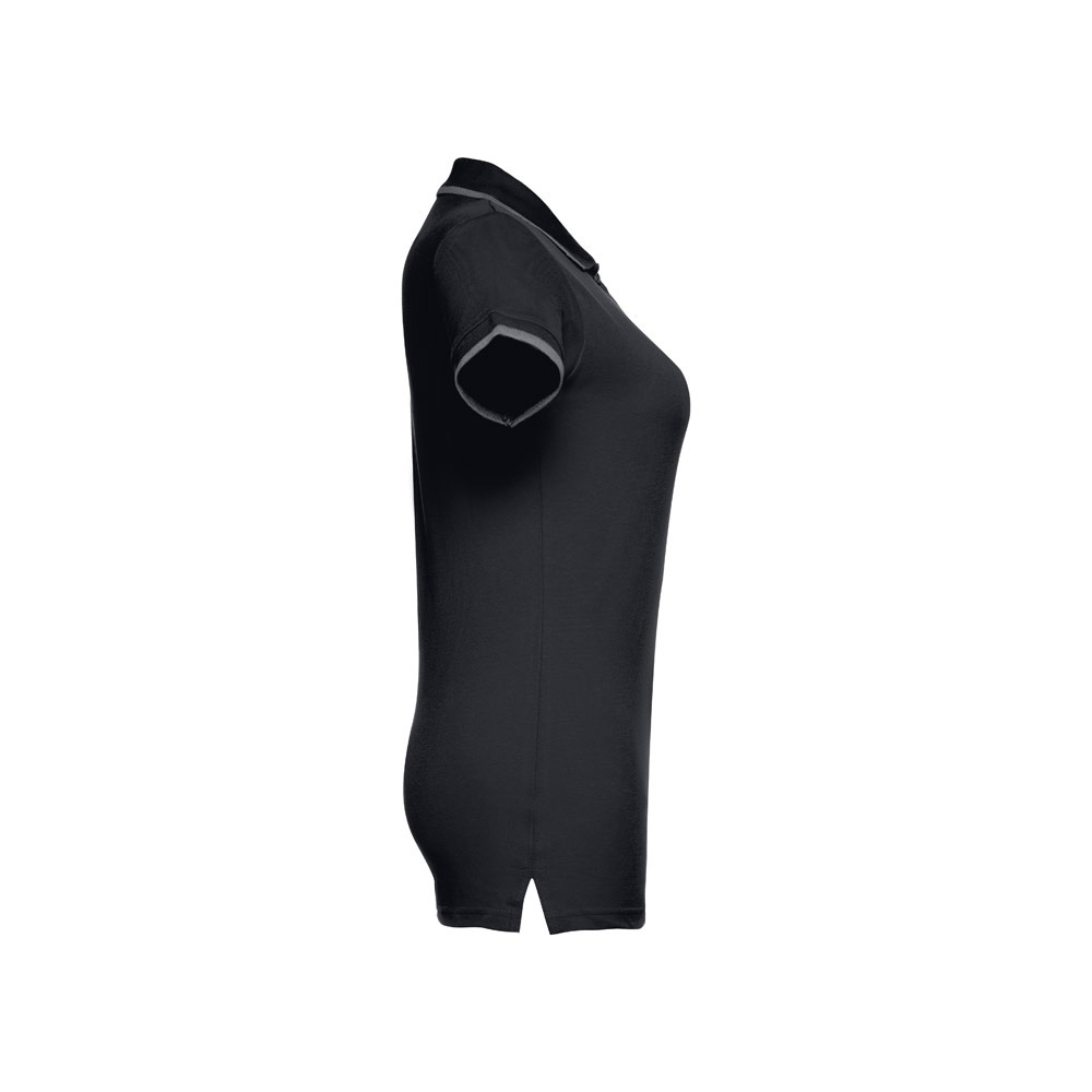 Polo bicolore a maniche corte da donna in piqué 100% cotone cardato (195 g/m²) (colore 183: 85% cotone/15% viscosa).Contrasto bicolore su girocollo, manica e abbottonatura. Girocollo e maniche a costine. Abbottonatura rinforzata con 3 bottoni a colore contrastante (bottone di riserva cucito all'interno). Vestibilità aderente con spacchetti laterali. Taglie: S, M, L, XL, XXL