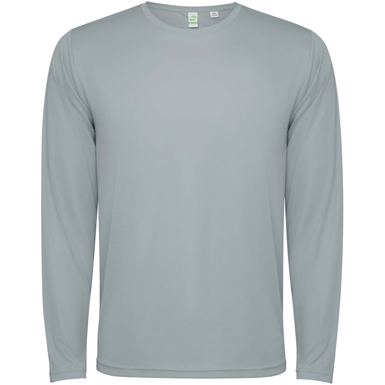 T-shirt tecnica da bambino a maniche lunghe. Collo con cuciture abbinate. Orlo posteriore leggermente più lungo di quello anteriore. Cuciture laterali spostate in avanti.