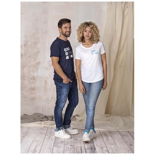 Abbigliamento promozionale sostenibile. Scollo rotondo. Cuciture laterali. Parte posteriore più lunga. Nastro da spalla a spalla. Doppia cucitura su colletto e sulla parte inferiore.