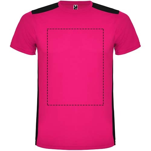 Tessuto tecnico traspirante che si asciuga rapidamente. Girocollo. Combinazione di due tessuti in poliestere sul retro e sulle spalle. Tessuto a occhio di pernice sul davanti e tessuto mesh 3D traspirante sul retro. Tessuto realizzato per assorbire l'umidità. Cucitura decorativa a zigzag con impuntura sui lati e sulle spalle. Parte posteriore leggermente più lunga. Etichetta rimovibile.