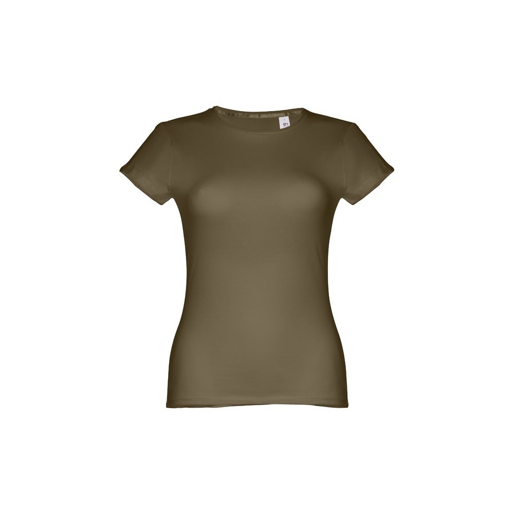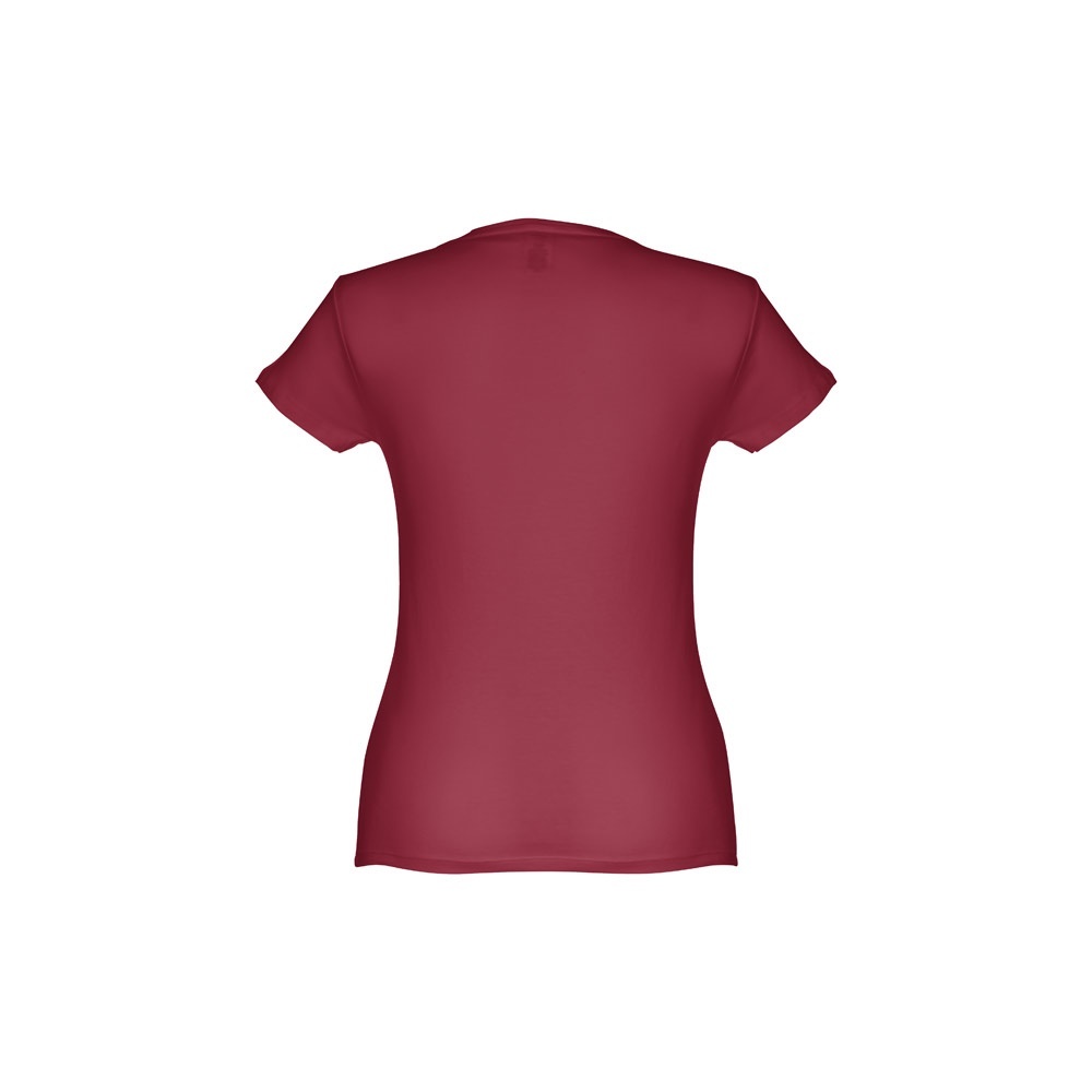 T-shirt aderente da donna in jersey di cotone 100% (150 g/m²) con filo in cotone cardato (colore: 183: 90% cotone/10% viscosa). Girocollo sottile in jersey con nastro di rinforzo in raso. Cuciture ribattute doppie sulle maniche e sull'orlo inferiore
