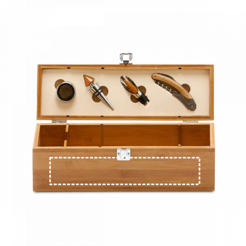 Set da vino in bambù, zinco e acciaio inox. Include un cavatappi con coltellino multiuso, un collare salvagoccia, un versatore con tappo e un tappo. Poiché il prodotto è realizzato con materiali naturali, il colore del prodotto e il risultato della stampa possono variare da un prodotto all'altro. 363 x 112 x 119 mm
