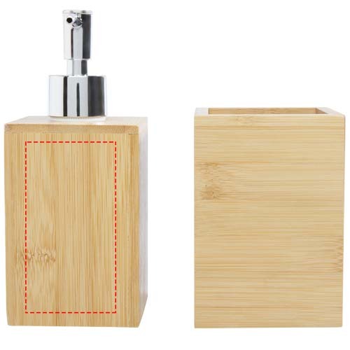 Set di 3 accessori per il bagno in bambù dal design moderno composto da un portasapone con filtro (11 x 8,2 x 2,4 cm), un dispenser per il sapone o altra lozione (7,1 x 7,2 x 16,8 cm) e un porta spazzolino da denti (8 x 8 x 11,5 cm). Il bambù utilizzato è ottenuto e prodotto in base a standard ecosostenibili.