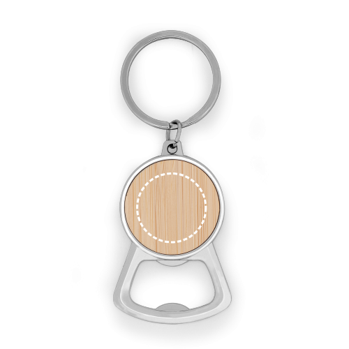 Portachiavi in ferro con forma rotonda in zinco e bambù. La funzione apribottiglie rende questo portachiavi un accessorio pratico da avere sempre a portata di mano. Fornito in un sacchetto di carta kraft. Poiché il prodotto è realizzato con materiali naturali, il colore del prodotto e il risultato della stampa possono variare da un prodotto all'altro. Anello: ø 32 mm | Prodotto: 58 x 39 x 3 mm | Connettore: 9 mm | Totale: 90 x 39 x 3 mm | Borsa: 100 x 55 mm