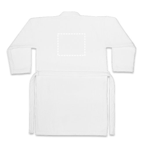 Accappatoio (350 g/m²) in cotone (82%) e cotone riciclato (18%). Ha un tessuto morbido al tatto, 1 cintura di regolazione e 2 tasche (1 per lato). Prodotto in Europa. Taglie: S / M| 620 X 1150 mm