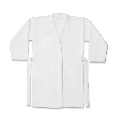 Accappatoio (350 g/m²) in cotone (82%) e cotone riciclato (18%). Ha un tessuto morbido al tatto, 1 cintura di regolazione e 2 tasche (1 per lato). Prodotto in Europa