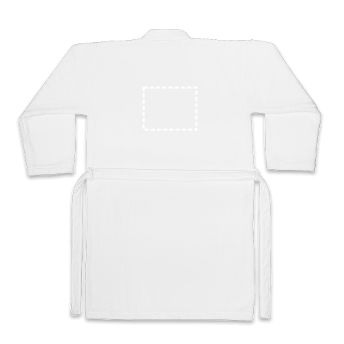 Accappatoio (350 g/m²) in cotone (82%) e cotone riciclato (18%). Presenta un tessuto morbido al tatto, 1 cintura di regolazione e 2 tasche (1 per lato). Con certificazione OEKO-TEK. Prodotto in Europa. Taglie: L/ XL | 660 x 1190 mm