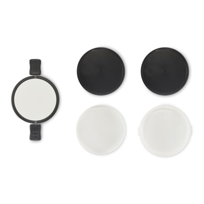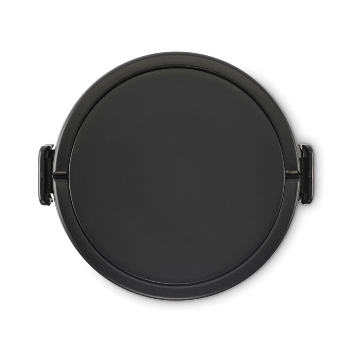 Portapranzo pranzo rotondo a due livelli in PP con chiusura a clip laterale e manici. Include coperchi interni. Capacità 250 ml in alto, 700 ml in basso.