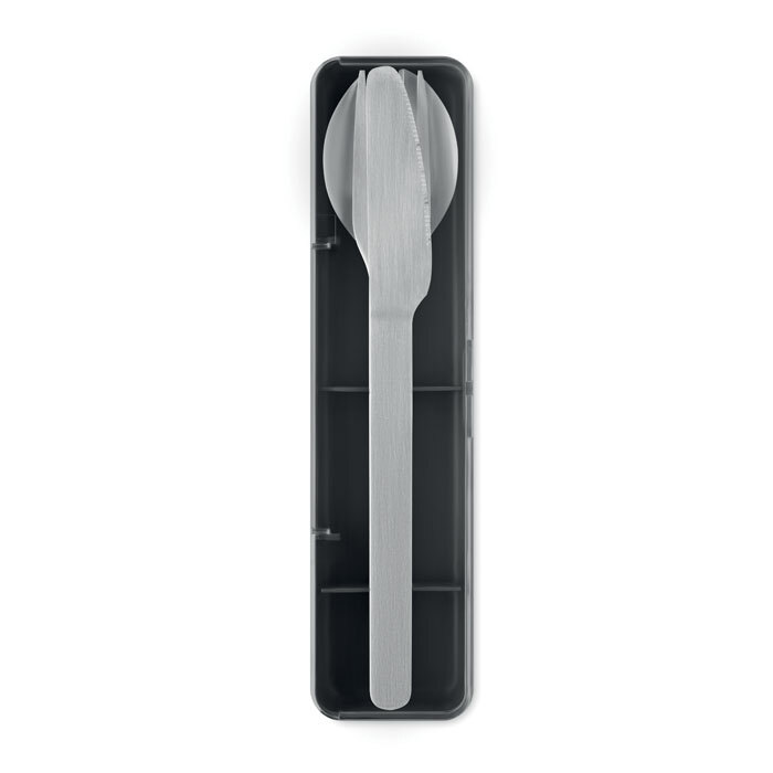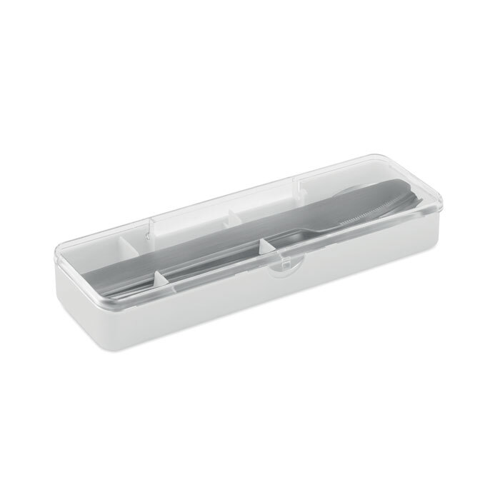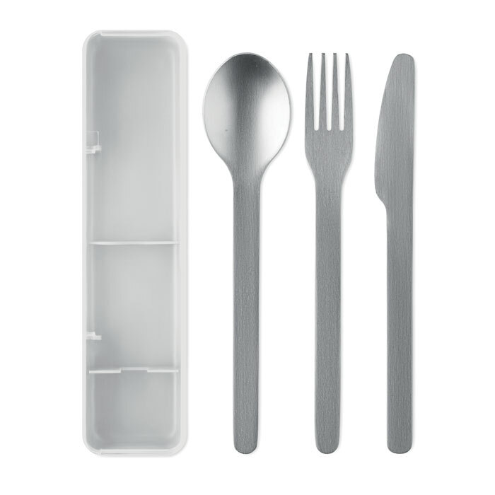 Set di posate in acciaio inox in custodia in PP. Il set comprende forchetta, coltello e cucchiaio.
