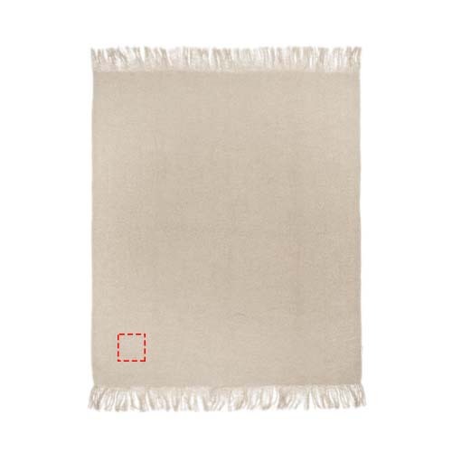 Morbidissima coperta in RPET certificato GRS, avvolta con un nastro RPET 190T. Confezionata in un sacchetto in plastica riciclata. Lunghezza delle frange: 10 cm su ogni lato. Dimensione del nastro: 72 cm x 4 cm.