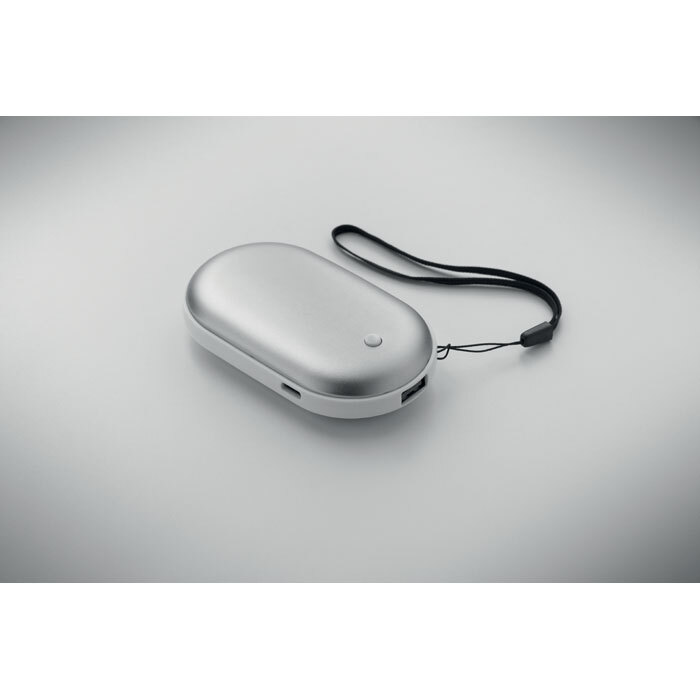 Scaldamani elettrico in alluminio con 3 livelli di calore (45°C, 50°C, 55°C), power bank da 5000mAh. Riscaldamento su due lati, in/out Type-C, uscita USB-A e DC5V/2A e cavo di ricarica incluso.