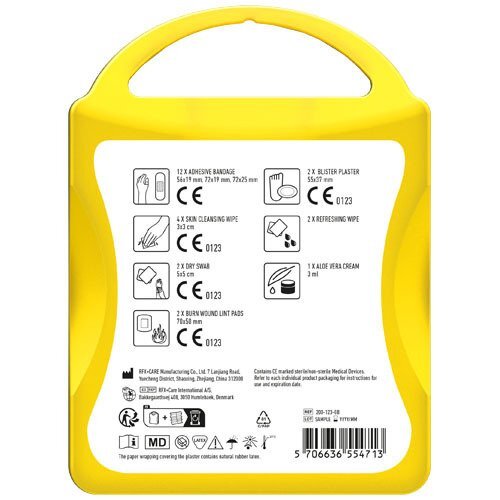 Il kit ideale per i viaggiatori. Con questo kit sarete preparati a trattare e curare i piccoli infortuni di viaggio. Contenuto: 12 cerotti resistenti all'acqua, 4 salviettine disinfettanti, 2 garze sterili, 2 garze per ustioni, 1 cerotto per vesciche, 2 salviettine rinfrescanti, 1 crema all'aloe vera. Tutti i prodotti contenuti nei MyKit rispettano le norme Europee vigenti. I prezzi includono stampa all-over fronte e retro.