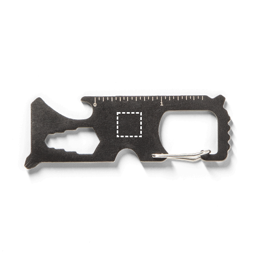 Carta multifunzione in acciaio inossidabile. Include 8 funzioni: sega, taglierina, chiave inglese, cacciavite, cacciavite Phillips, scala di misurazione, apribottiglie e portachiavi