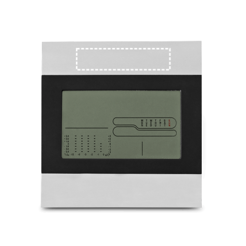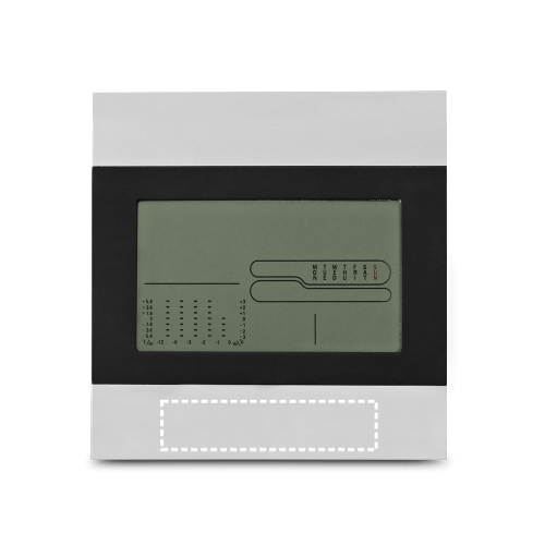 Stazione meteorologica da tavolo con schermo LCD in alluminio e ABS. Include funzioni di orologio, sveglia, calendario, termometro e misurazione dell'umidità. Include 2 batterie AAA. Fornita in una confezione regalo bianca. 130 x 130 x 19 mm