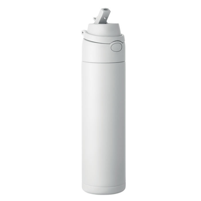 Bottiglia singolo strato in acciaio inox riciclato (90% inox riciclato e 10% acciaio inox). Dispone di una cannuccia 2 in 1 e di un coperchio in PP con manico. Senza perdite. Capacità: 750 ml.
