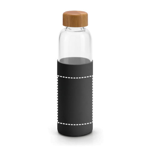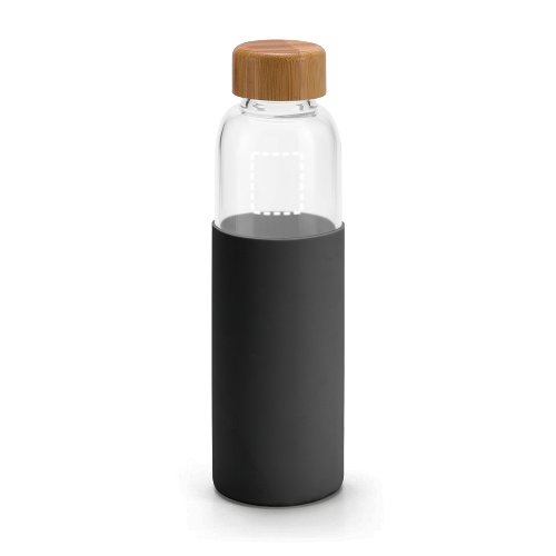 Borraccia in vetro borosilicato con tappo in bambù e protezione in silicone. Capacità di 600 mL. Fornito in confezione regalo. Poiché il prodotto è realizzato con materiali naturali, il colore del prodotto e il risultato della stampa possono variare da un prodotto all'altro. ø68 x 231 mm