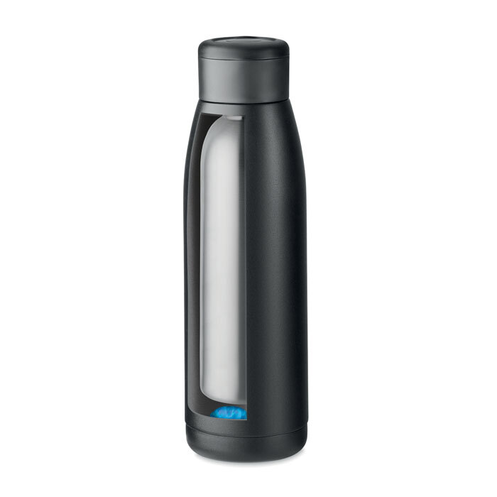 Bottiglia doppio strato in acciaio inox riciclato (90% riciclato e 10% acciaio inox) coperchio ad anello in morbido silicone. Agitando la bottiglia, la temperatura della superficie cambia in caldo o freddo, in base al liquido contenuto. 400 ml.