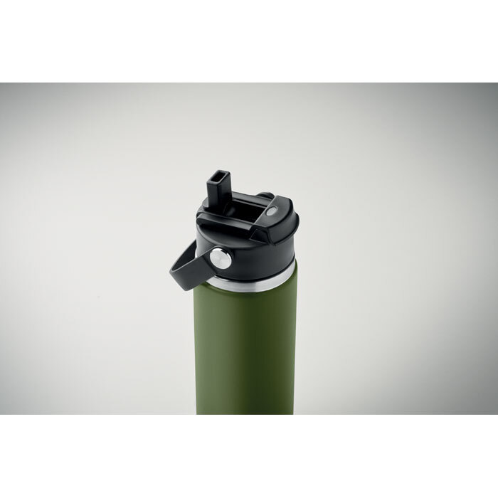 Bottiglia isolata a doppio strato in acciaio inossidabile riciclato (90% acciaio inossidabile riciclato e 10% acciaio inossidabile), cannuccia combinata, coperchio con manico. Senza perdite. 500 ml.
