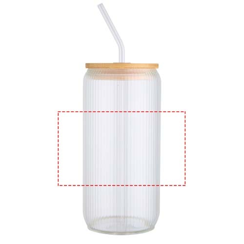 Contenitore in vetro borosilicato con cannuccia di vetro e coperchio in bambù. L'interno del contenitore è caratterizzato da un design scanalato mentre la superficie esterna liscia è ideale per la stampa di un logo. Il bambù utilizzato proviene da fonti sostenibili, responsabili dal punto di vista ambientale e sociale. Fornito in una confezione regalo in cartone riciclato. Capacità: 650 ml.