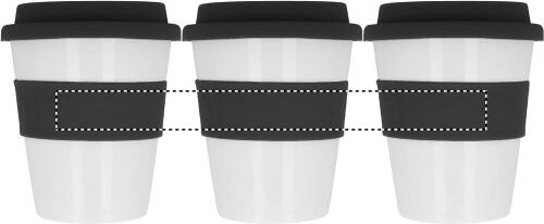Bicchiere da bibita in PP bianco lucido a strato singolo, con coperchio e anello intermedio in silicone. Capacità 350ml. Disponendo di un solo strato potrebbe scaldarsi anche esternamente.