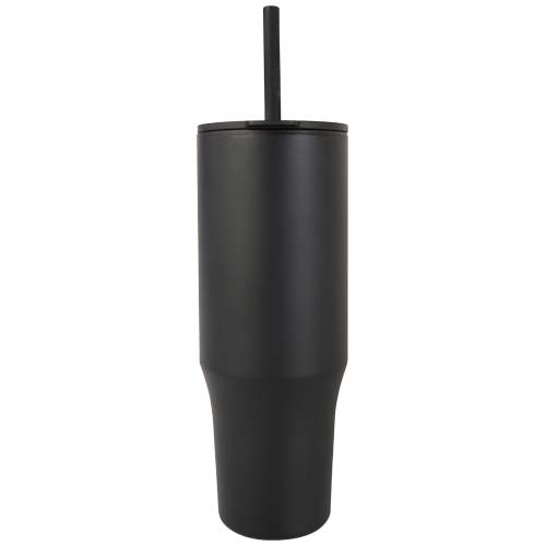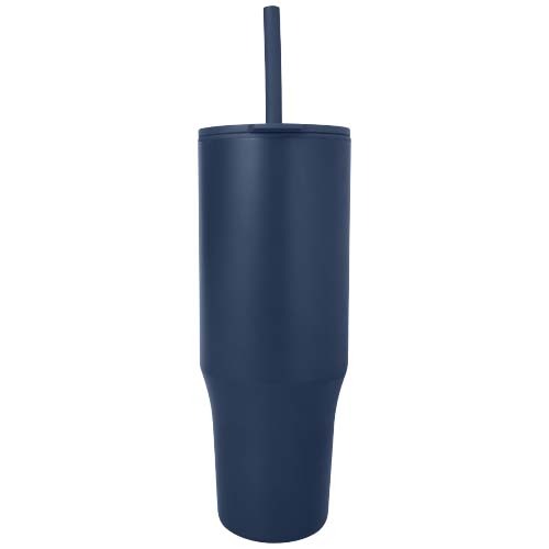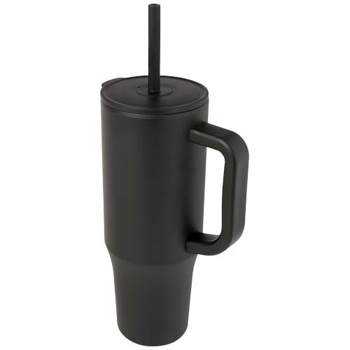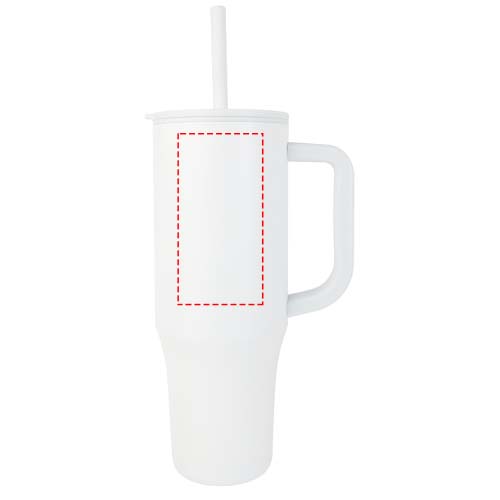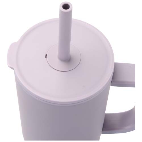 Bicchiere con robusta parete esterna in acciaio inossidabile riciclato certificato RCS e parete interna in plastica. Include una cannuccia integrata in silicone per uso alimentare e un coperchio a pressione a prova di schizzi per un semplice utilizzo. Questo bicchiere è adatto anche per le bevande calde, ma si sconsiglia di berle utilizzando la cannuccia. Per far raffreddare la bevanda, togliere il coperchio prima di berla. Capacità: 900 ml. Lavabile solo a mano.