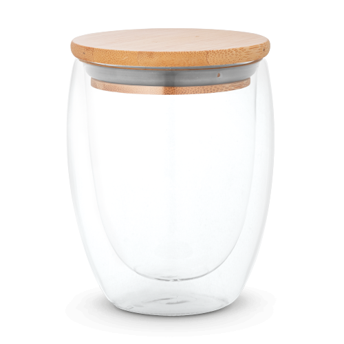 Bicchiere da viaggio in vetro borosilicato con doppio corpo con isolamento ad aria e tappo in bambù con isolamento in silicone. Capacità fino a 350 mL ideale per liquidi freddi e/o caldi e adatto a microonde e lavastoviglie, una volta rimosso il tappo. Fornito in confezione regalo di carta kraft. Poiché il prodotto è realizzato con materiali naturali, il colore del prodotto e il risultato della stampa possono variare da un prodotto all'altro