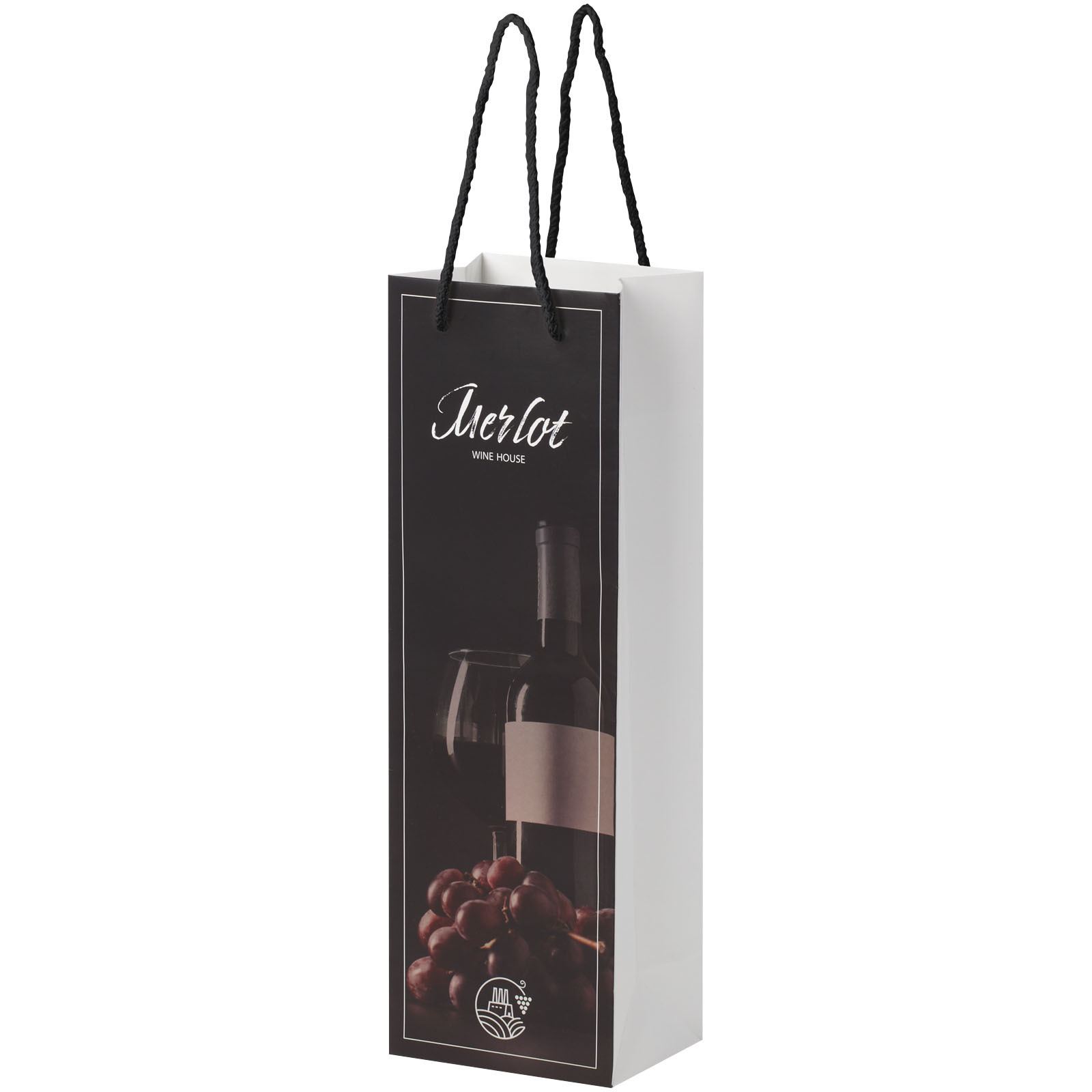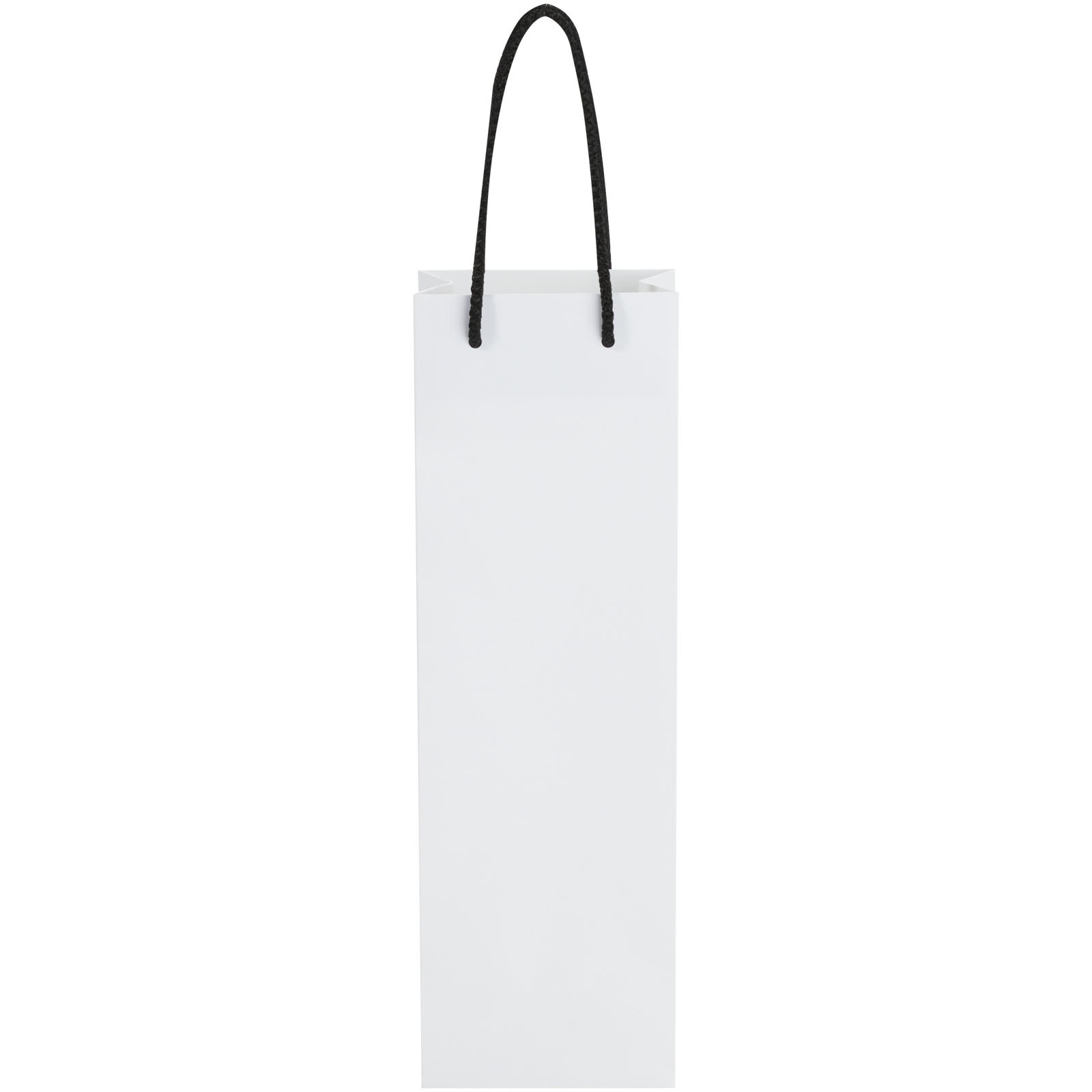 Sacchetto per bottiglia di vino di carta integra da 170 g/m² opaca realizzato a mano (12 x 9 x 37 cm) con manici di plastica. La parte anteriore e posteriore personalizzabili offrono un ampio spazio per stampare un logo o qualsiasi altro design, rendendolo un ottimo strumento di marketing aziendale. Realizzata in Europa e riciclabile al 100%.