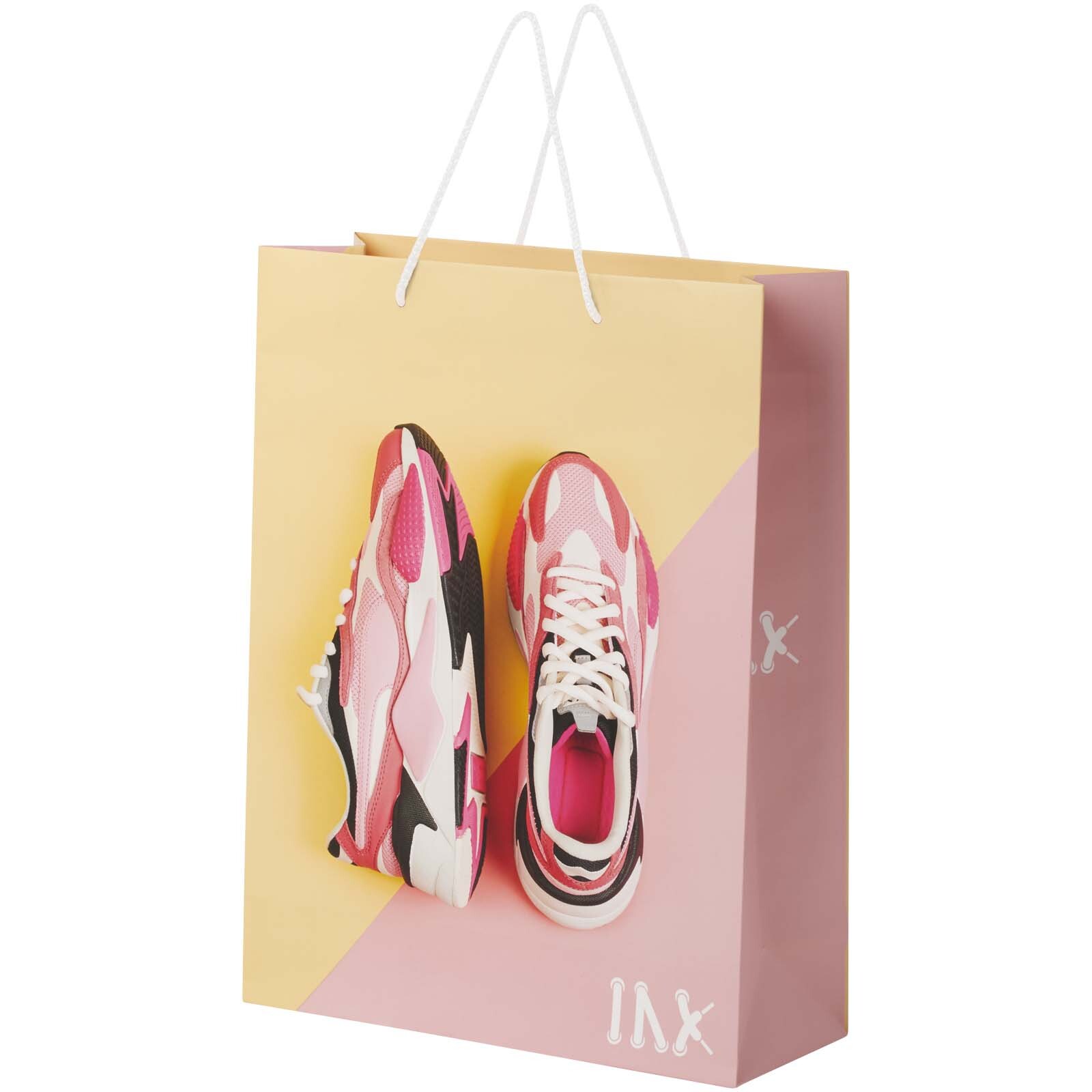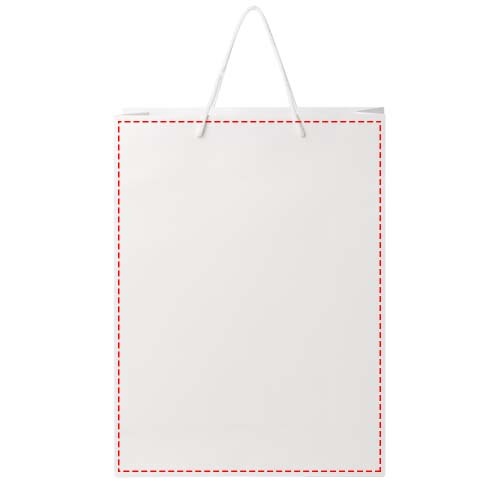 Sacchetto extra large di carta integra da 170 g/m² opaca (31 x 12 x 41 cm) realizzato a mano con manici di plastica. La parte anteriore e posteriore personalizzabili offrono un ampio spazio per stampare un logo o qualsiasi altro design, rendendolo un ottimo strumento di marketing aziendale. Realizzata in Europa e riciclabile al 100%.
