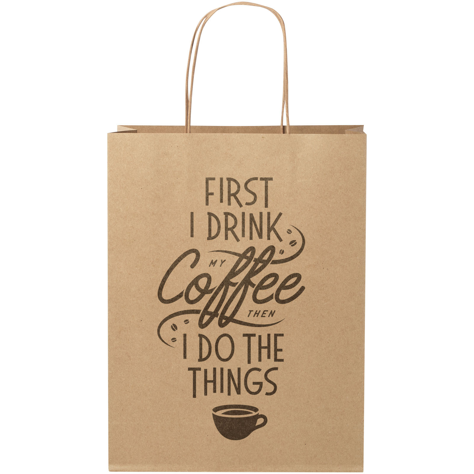 Shopper medio in carta kraft da 120 g/m² (24 x 9 x 32 cm) con manici di carta intrecciati. La parte anteriore e posteriore personalizzabili offrono un ampio spazio per stampare un logo o qualsiasi altro design, rendendolo un ottimo strumento di marketing aziendale. Realizzato in Europa e riciclabile al 100%, questo sacchetto è una scelta più sostenibile per aziende e persone attente all'ambiente in cerca di una soluzione per il confezionamento sostenibile.