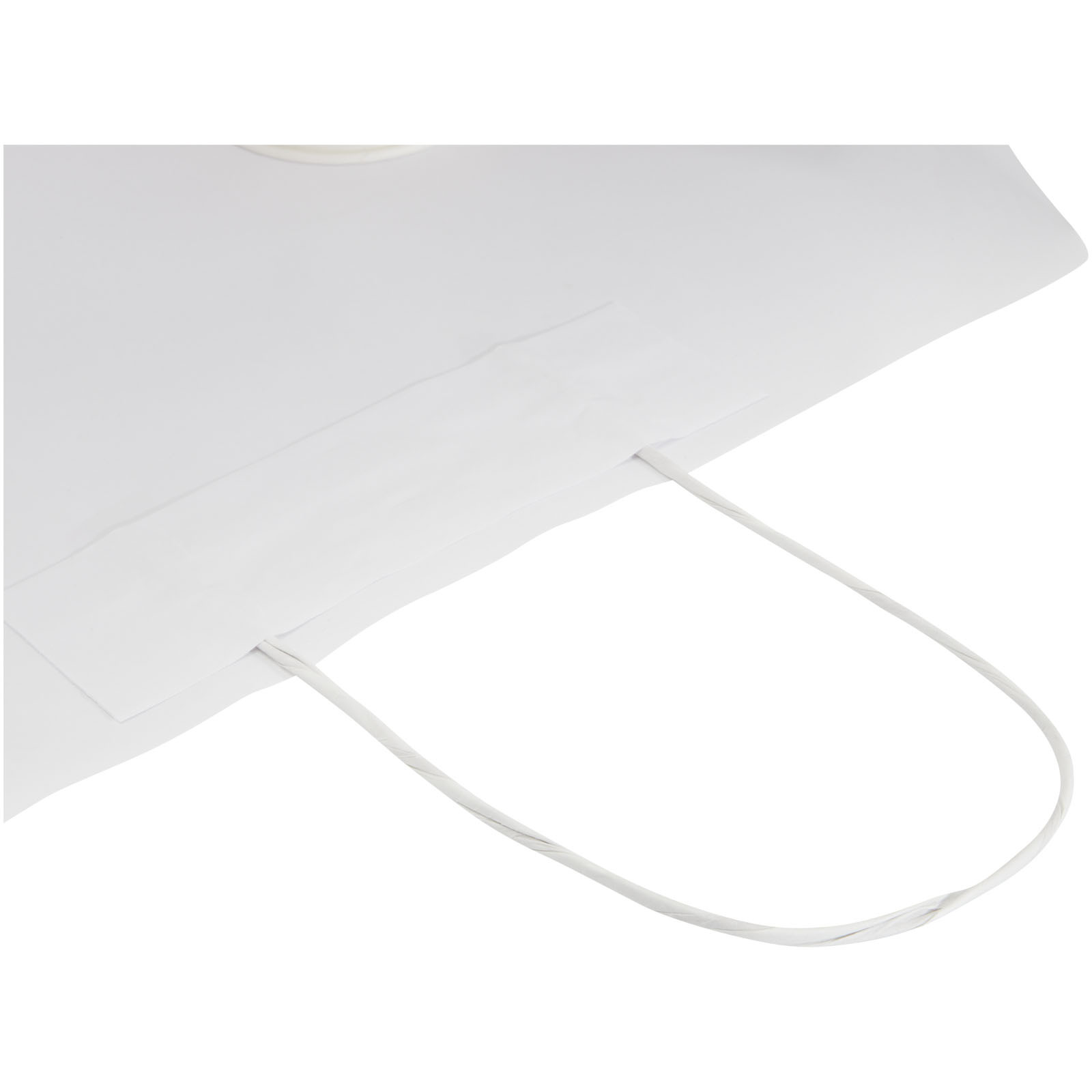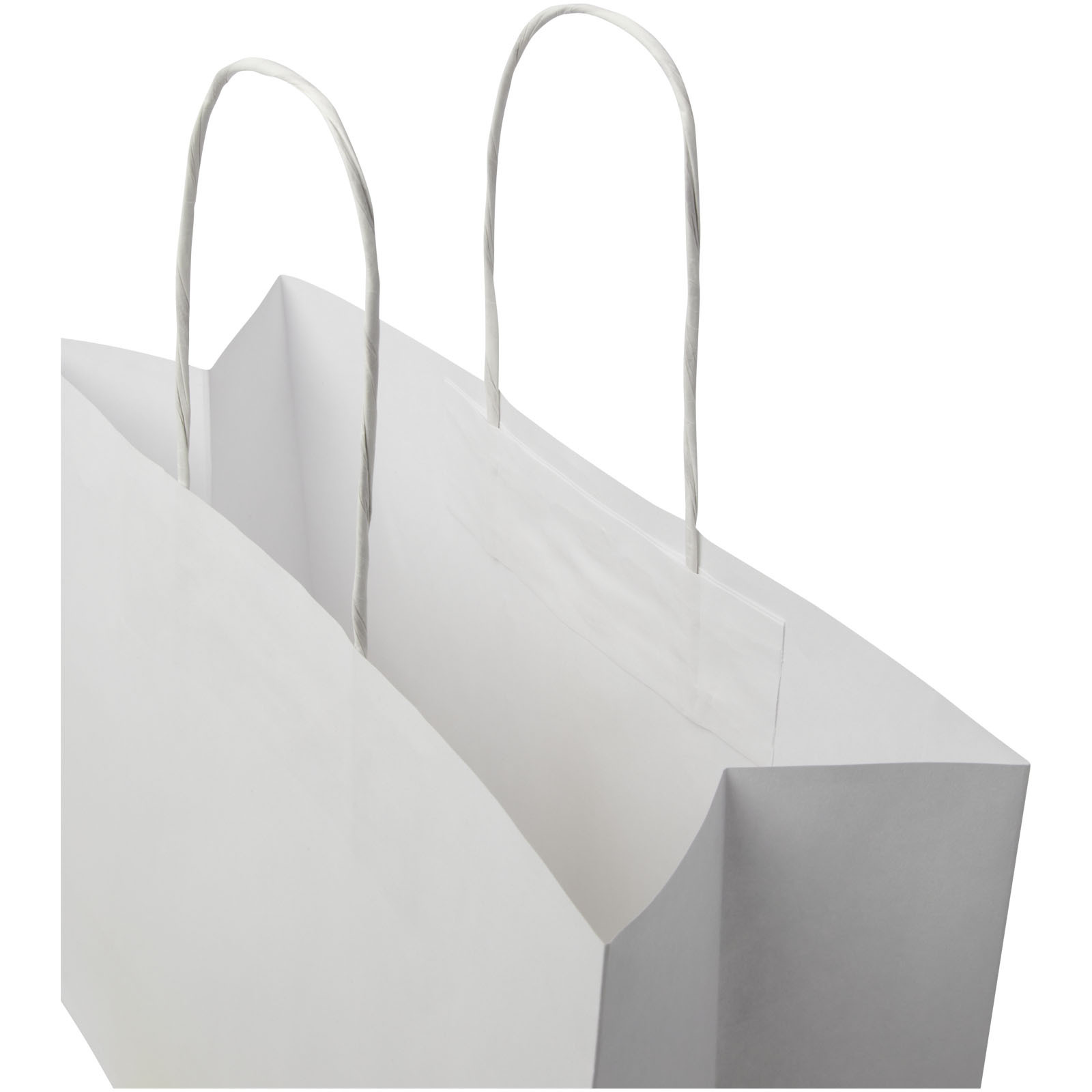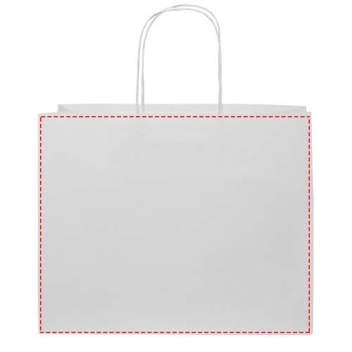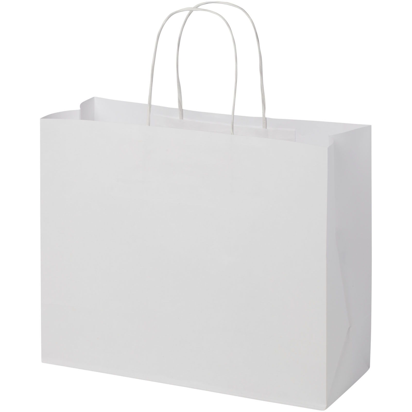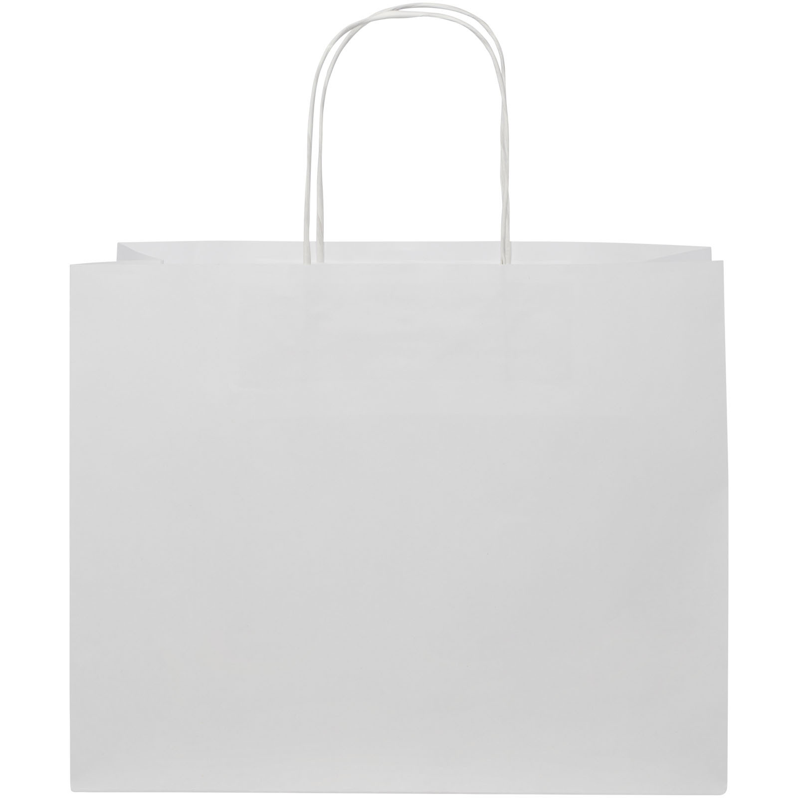 Shopper grande in carta kraft da 120 g/m² (31 x 12 x 25 cm) con manici di carta intrecciati. La parte anteriore e posteriore personalizzabili offrono un ampio spazio per stampare un logo o qualsiasi altro design, rendendolo un ottimo strumento di marketing aziendale. Realizzato in Europa e riciclabile al 100%, questo sacchetto è una scelta più sostenibile per aziende e persone attente all'ambiente in cerca di una soluzione per il confezionamento sostenibile.