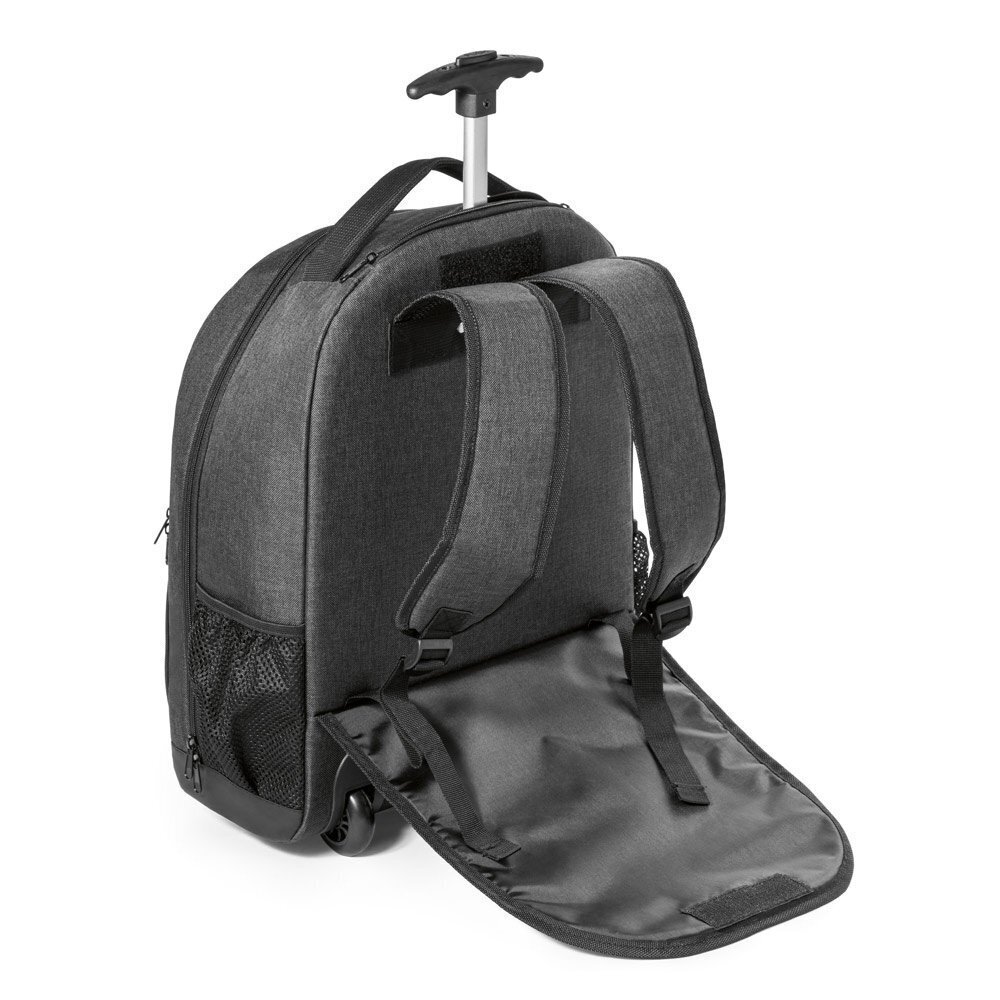 Zaino trolley per computer in 600D ad alta densità e poliestere 600D impermeabile. Scompartimento per computer fino a 15.6”. Possiede tasche laterali in rete e una tasca frontale con doppia cerniera. Zaino trolley con protezione ruote e manico estensibile in metallo. Parte posteriore e spallacci imbottiti. Include un’etichetta in metallo rimovibile con magnete per facilitare la personalizzazione. Capacità fino a 21 L
