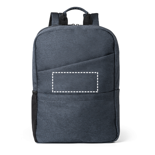 Zaino per computer in 600D poliestere riciclato con spallacci imbottiti. Lo scompartimento principale ha 2 divisori imbottiti per computer fino 15.6" e tablet fino 10.5". Due tasche con chiusura sulla parte frontale e una tasca laterale in rete con elastico. La parte superiore è imbottita e con fascia per trasporto trolley. Capacità fino a 12 L