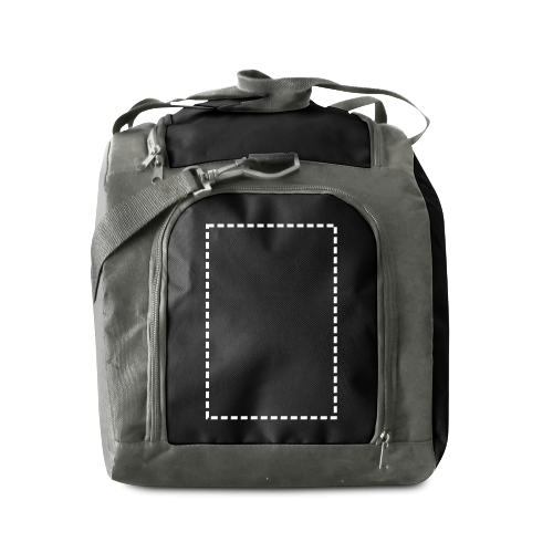 Borsone sportivo in 600D, tasca anteriore e fondo con base semirigida. Tasca frontale e tasca laterale per scarpe, entrambe con zip. Tracolla regolabile. Capacità fino a 30 L
