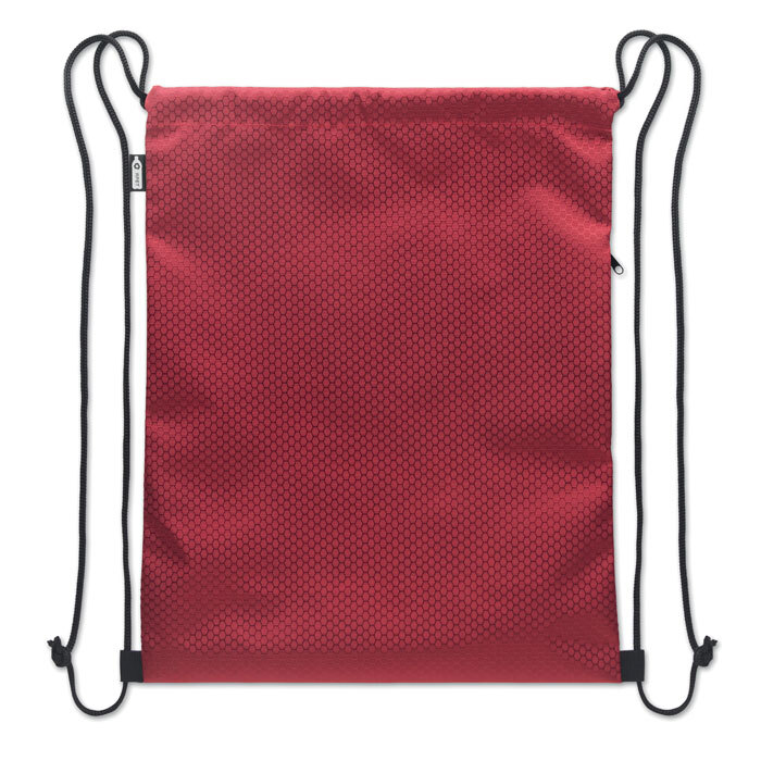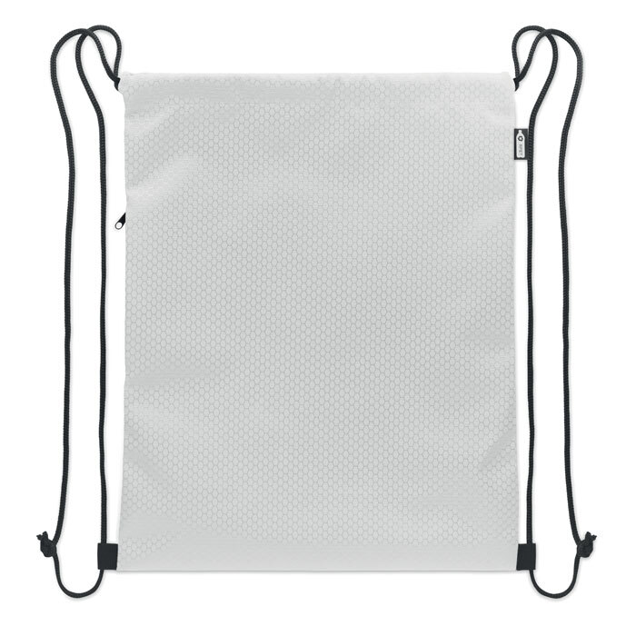 Sacca in poliestere RPET 420D con tasca laterale verticale con zip e fodera in RPET 210D. Presenta corde resistenti su entrambi i lati. Capacità 4,5L, carico massimo 5 kg.