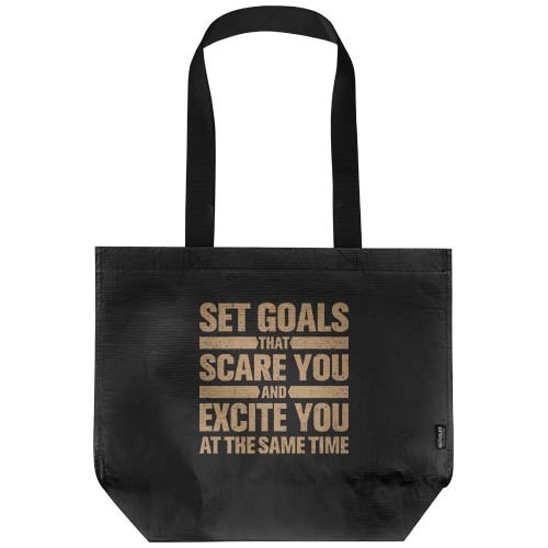 La tote bag Duo con fondo doppio laminato è realizzata in RPET certificato GRS da 150 g/m² e offre una maggiore durata e resistenza all'acqua quando serve. Presenta uno spazioso scomparto principale aperto, robuste maniglie rinforzate e un ampio fondo per una maggiore capienza. Progettata per trasportare fino a 10 kg, è un'opzione elegante e affidabile per le commissioni quotidiane, le fiere o gli eventi promozionali. Capacità: 18 litri.