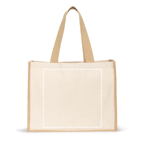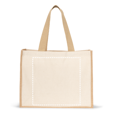 Borsa in tela (320 g/m²), con fondo e fianchi in juta laminata (350 g/m²) nei toni naturali. Dotata di manici da 60 cm. 420 x 330 x 190 mm