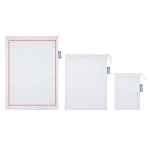 Set di tre sacchetti per frutta e verdura riutilizzabili realizzati al 100% in poliestere riciclato da 60-65 g/m² con chiusura a coulisse Disponibili nelle misure 15 x 21 cm, 25 x 32 cm, 30 x 41 cm. L'utilizzo di questi sacchetti fornisce un contributo eco-friendly alla riduzione delle borse di plastica. La resistenza di questi prodotti ne garantisce lavabilità e riutilizzabilità, assicurandone al contempo pulizia ed igiene. Stampabili su tutta la superficie in sublimazione. Realizzati in Europa.