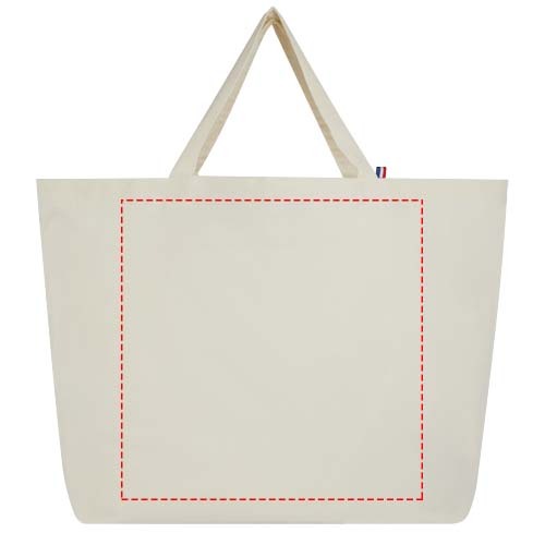 Questa Tote bag di grande capacità è realizzata con i materiali migliori, riciclati al 100%. È costruita per essere utilizzata nella vita di tutti i giorni ed è adatta a trasportare libri pesanti o generi alimentari. La miscela di cotone/poliestere riciclato da 200 g/m² garantisce durata e affidabilità, conferendo alla borsa una resistenza fino a 14 kg di peso. I filati provengono dall'Asia, ma la tessitura, la filatura e la produzione avvengono in Francia.
