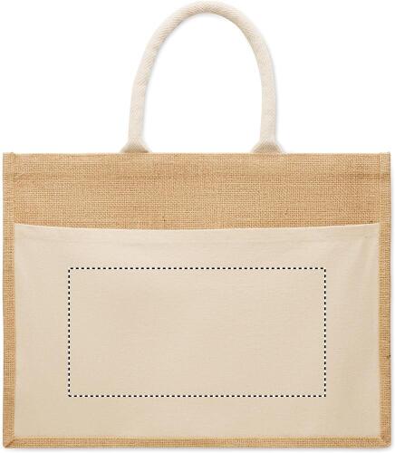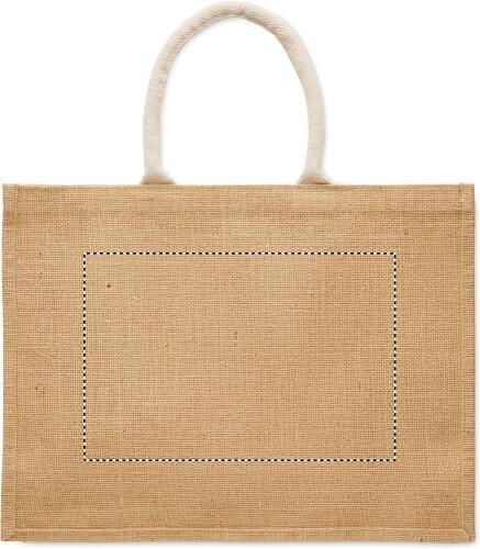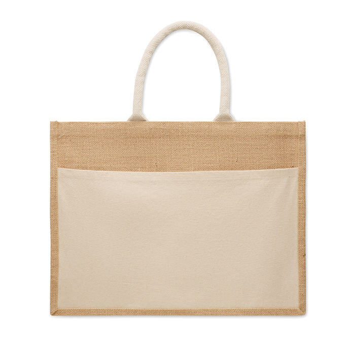 Shopper in juta laminata e tela di cotone da 280 gr/m² con manici in corda. Include un'ampia tasca frontale aperta.