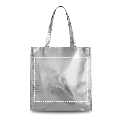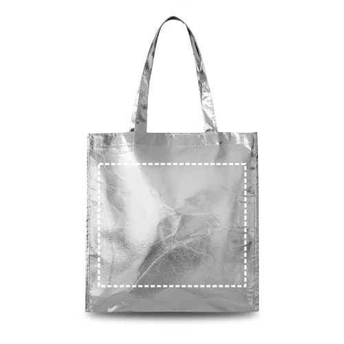 Borsa in TNT laminato metallizzato (90 g/m²) con manici da 50 cm di lunghezza. 340 x 350 x 80 mm