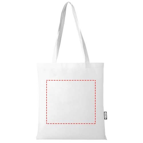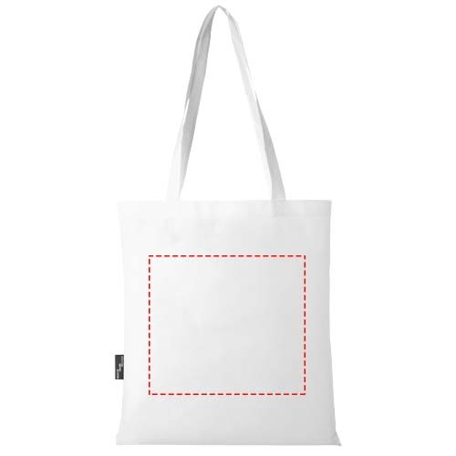 Realizzata in PET riciclato robusto e resistente agli strappi, la tote bag Zeus in materiale riciclato certificato GRS è un'opzione perfetta e più responsabile per fiere e conferenze. Grazie al design sottile, questa borsa è elegante e adatta per trasportare oggetti leggeri, come un blocco note e una penna. Caratterizzata da manici lunghi 29 cm, questa tote bag può anche essere trasportata a tracolla. Resistenza fino a 5 kg di peso.