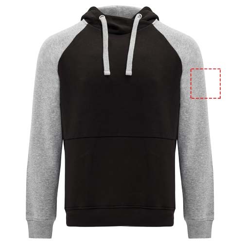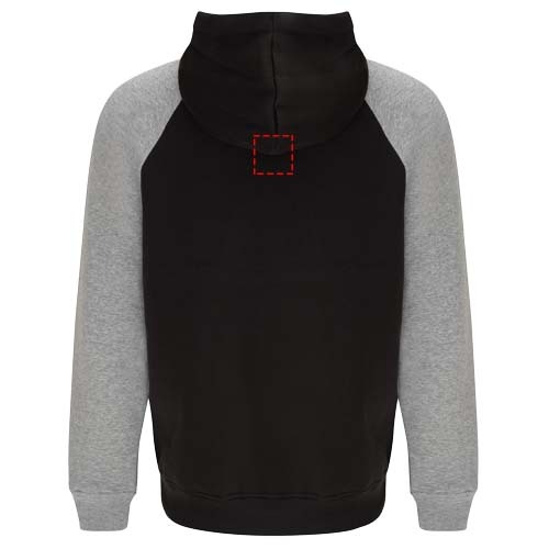 Felpa con cappuccio unisex bicolore. Cappuccio con collo incrociato e occhielli in metallo. Cappuccio interno a contrasto, cordoncino e maniche raglan. Tasca a canguro. Polsini e orlo in maglia a coste 1x1 in elastan. Etichetta rimovibile.